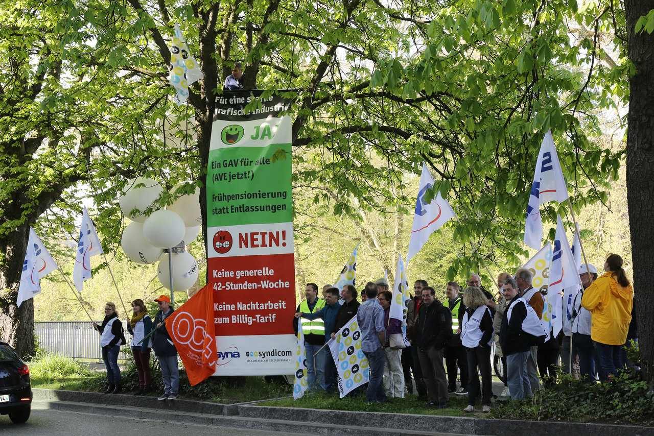 Der Arbeitgeberverband der Druckindustrie Viscom hat am 23. April den Gesamtarbeitsvertrag (GAV) für die grafische Industrie per Ende 2015 gekündigt und fordert die Erhöhung der Normalarbeitszeit von 40 auf 44 Stunden und eine weitere Senkung der Nachtzuschläge. Die Gewerkschaften syndicom und Syna lehnen dieses Programm zur Vernichtung von Arbeitsplätzen ab und fordern ein Frühpensionierungsmodell und die Allgemeinverbindlichkeit des GAV.