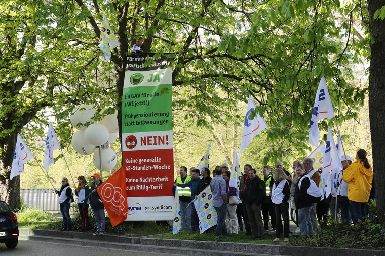 Das Nein des Viscom zu dieser Vernunftslösung haben wir gehört. Mit der Allgemeinverbindlichkeit des GAV und einem Frühpensionierungsmodell ab 63/62 Jahren präsentieren die Gewerkschaften Lösungen, die sozialverträglich die Probleme der Branche angehen. Gegen eine Aushöhlung des GAV werden sie sich mit allen gewerkschaftlichen Mitteln zur Wehr setzen.Eine Verschlechterung der Arbeitsbedingungen auf das Niveau der internationalen Konkurrenz z.B. in Osteuropa und China kommt nicht infrage.