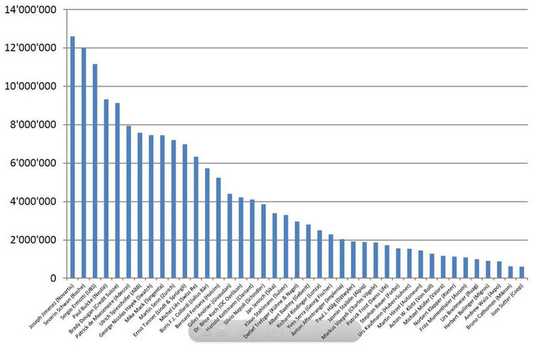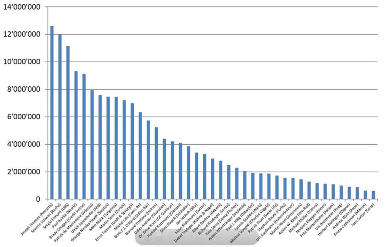 Die Podestplätze im Unia-Ranking der bestbezahlten CEO nehmen erneut Novartis (José Jimenez 12,7 Mio. Franken), Roche (Severin Schwab 12 Mio.) und UBS (Sergio Ermotti 11.1 Mio.) ein. Aufsteiger des Jahres sind Michael Mack von Syngenta (plus 64.6% auf 7.5 Mio.), Bernard Fontana (Holcim, plus 55.2% auf 5.2 Mio.) und Patrick de Maesen (Adecco, plus 30.8% auf 7.9 Mio.). Im Durchschnitt stiegen die Höchstlöhne der untersuchten Firmen um durchschnittlich 5.2%, jene der Arbeitnehmenden hingegen stiegen nur um 0.8%.