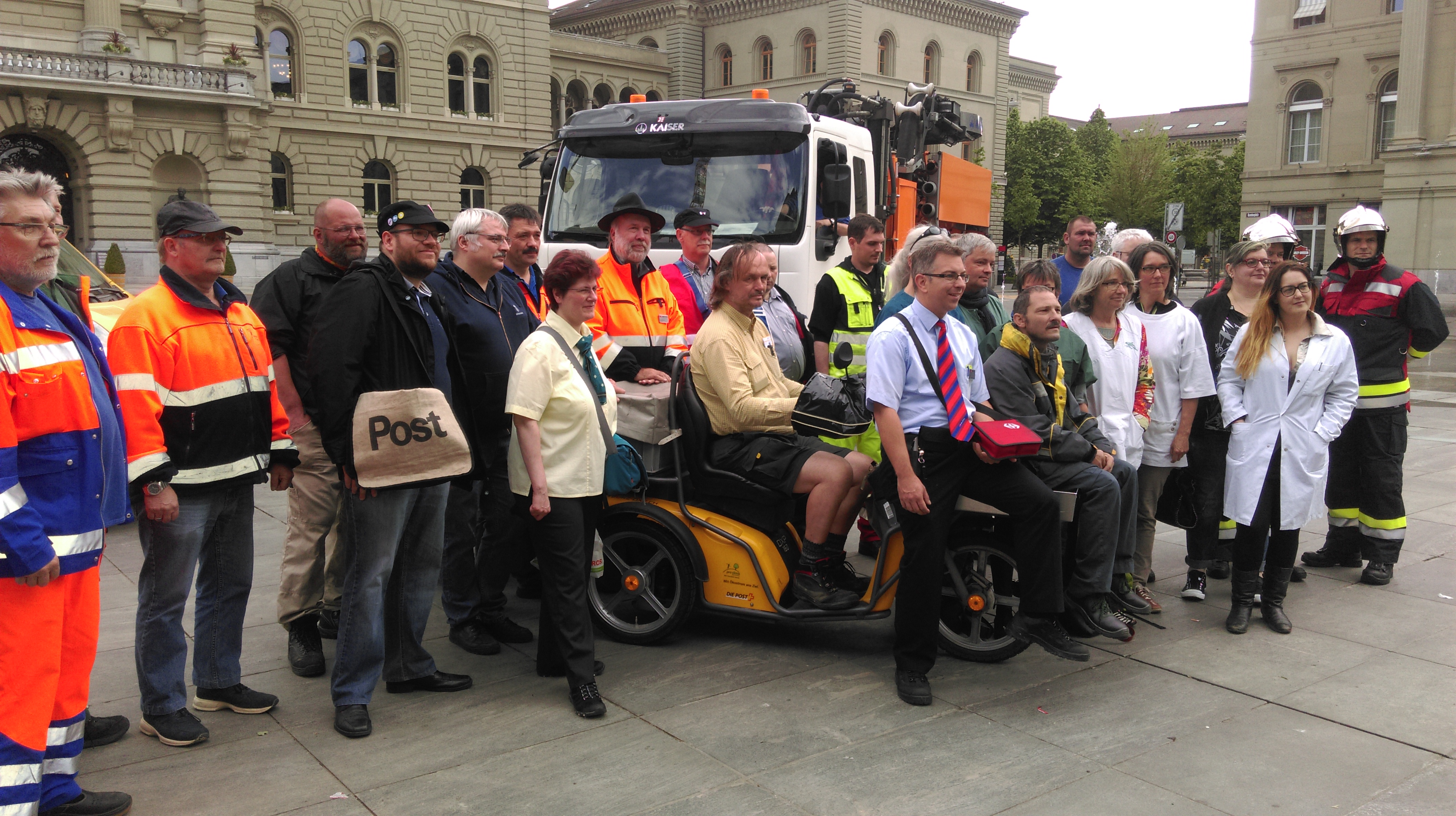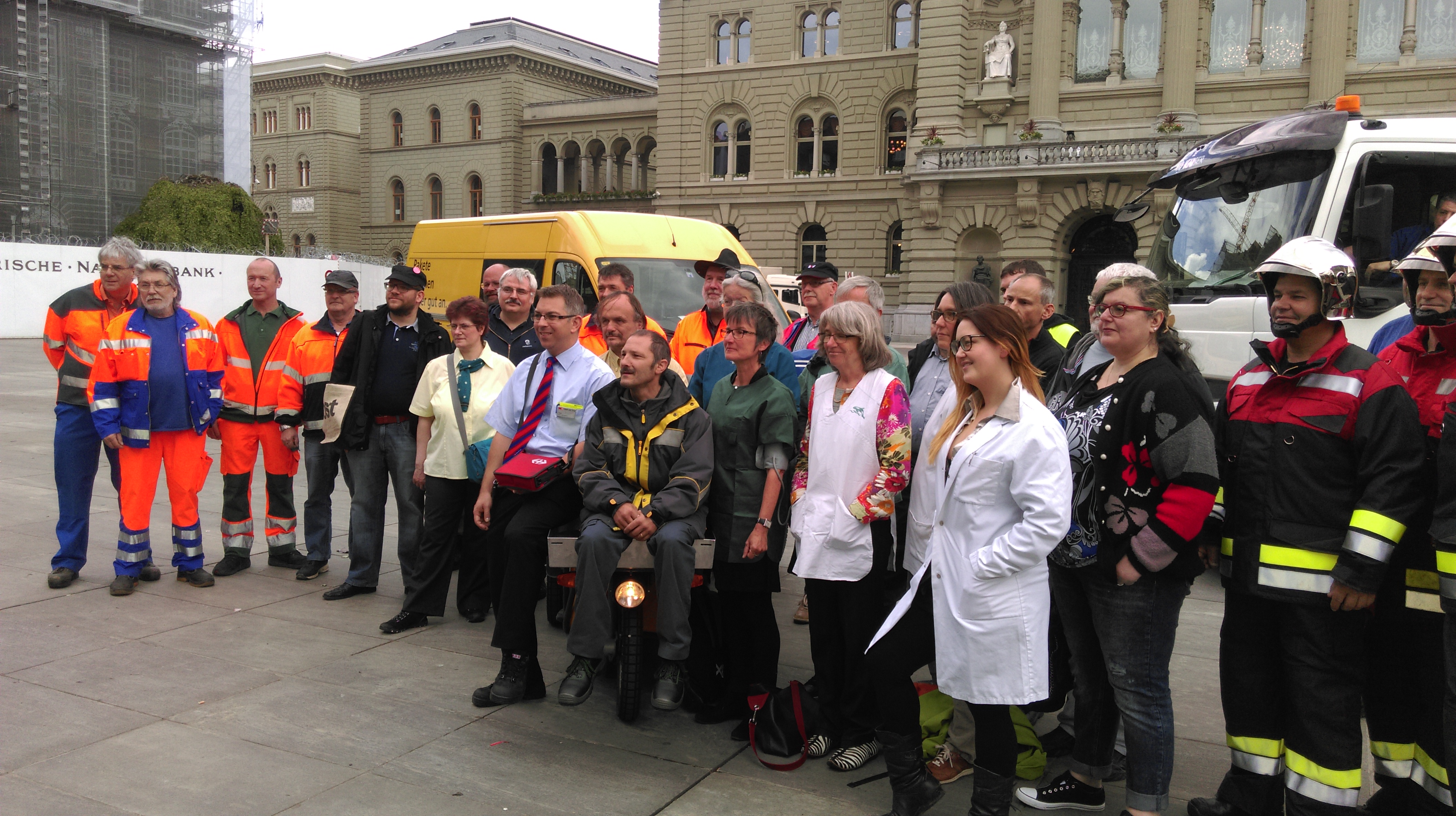 Die anwesenden PöstlerInnen, Zugsbegleiter, Feuerwehrleute, Lehrerinnen und Pflegenden lehnen die Service-public-Initiative entschieden ab. Sie wird schlussendlich zu weniger Service public führen, wird die Privatisierung der Swisscom fördern und bei SBB, Post und Swisscom die bisherigen sozialpartnerschaftlichen Lohnverhandlungen verunmöglichen. (SGB)