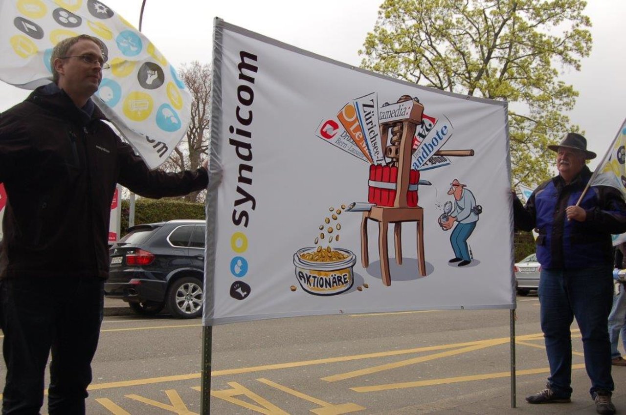 Am 8. April demonstrierte syndicom zusammen mit Angestellten der Druckzentren vor der Aktionärsversammlung von Tamedia gegen den Austritt des Konzerns aus dem viscom. Es ist ein Skandal, dass Tamedia versucht, sich auf diesem Weg aus dem Gesamtarbeitesvertrag zu stehlen.